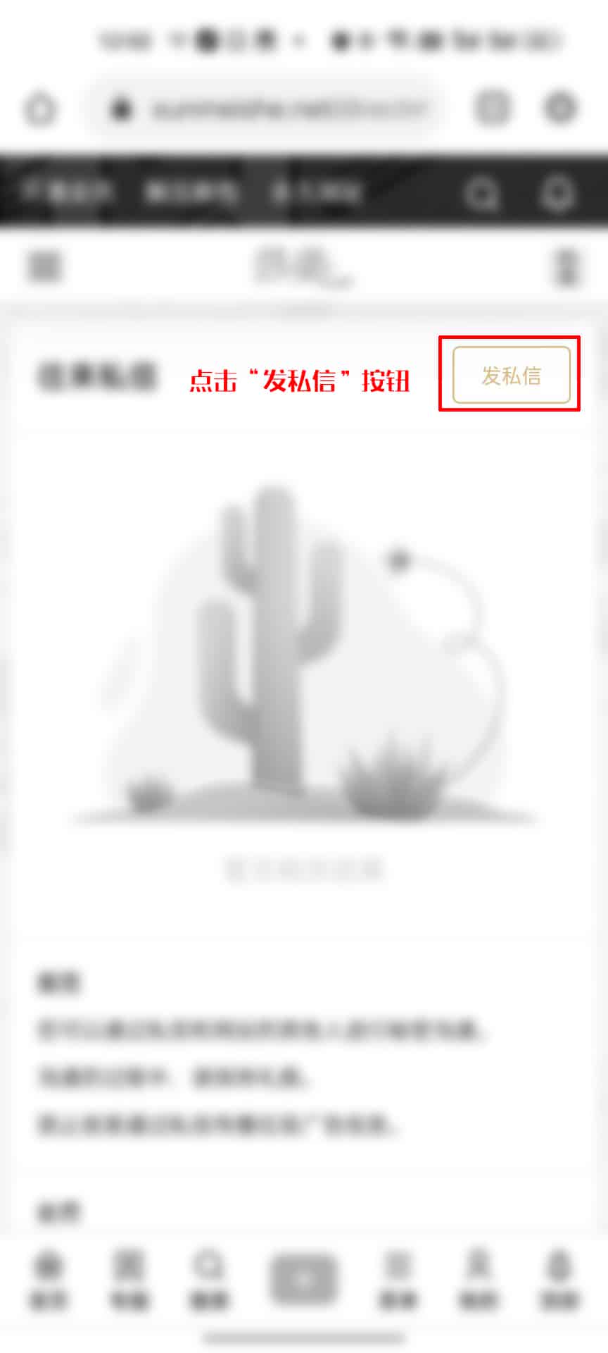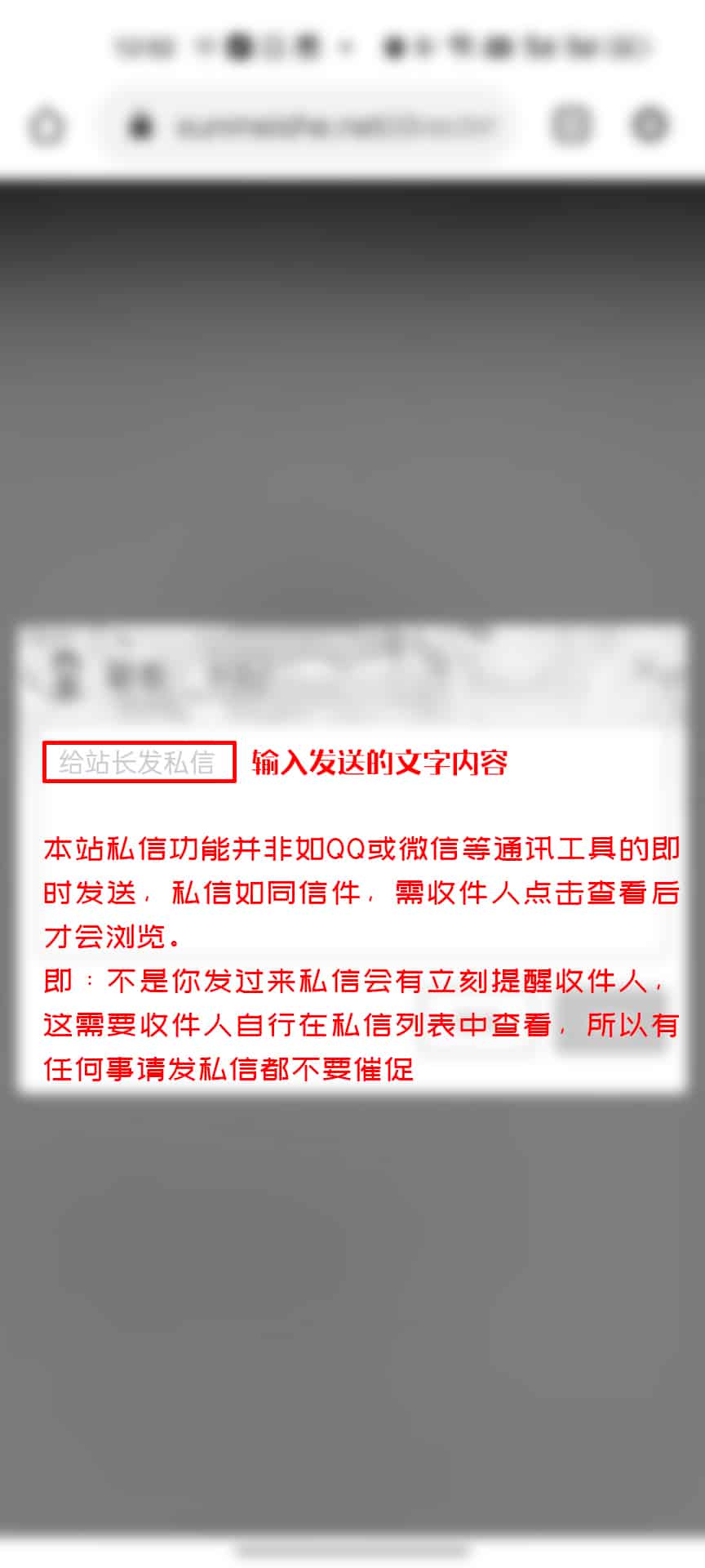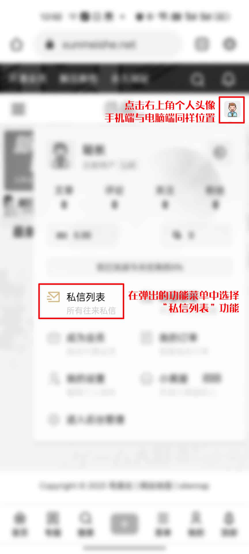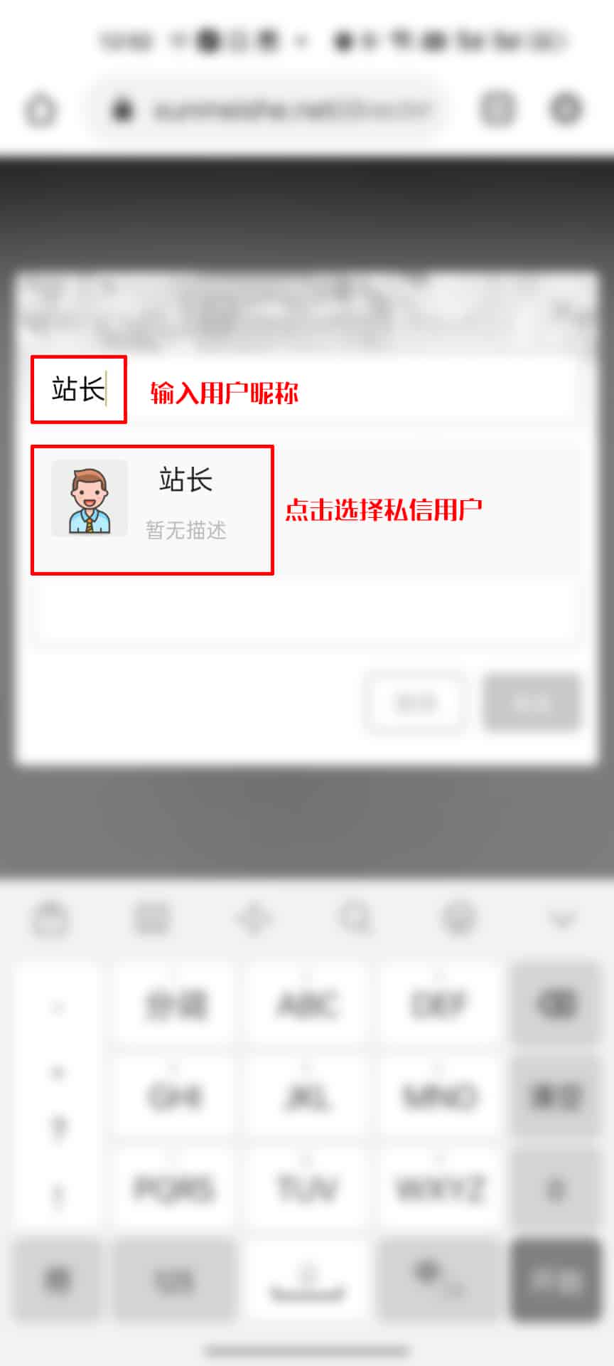 除图片流程外,同样可以使用本站搜索功能发送私信,即:搜索-输入内容-选择分类(用户/文章/专题…等),如寻找用户的话,使用搜索输入用户名-选择用户-点击发送私信。